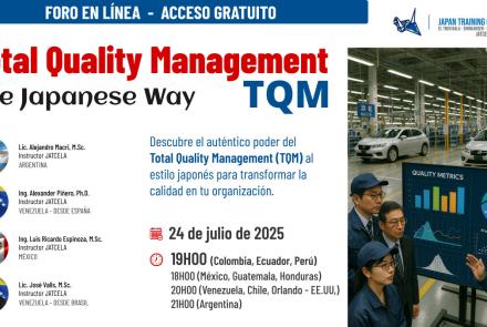 Conviértete en un experto en calidad total con el enfoque japonés, de acuerdo al Modelo Original del Total Quality Management (TQM) al estilo japonés definido por la Unión Científica de Ingenieros Industriales del Japón (JUSE), institución rectora que administra el Premio Deming a la Calidad en Japón desde 1951. Este programa te brinda herramientas clave para liderar procesos de mejora continua, reducir errores y fortalecer la cultura organizacional. Aprende con instructores formados en Japón y obtén una certificación internacional que transformará tu perfil profesional. ¡Es momento de impulsar la excelencia!